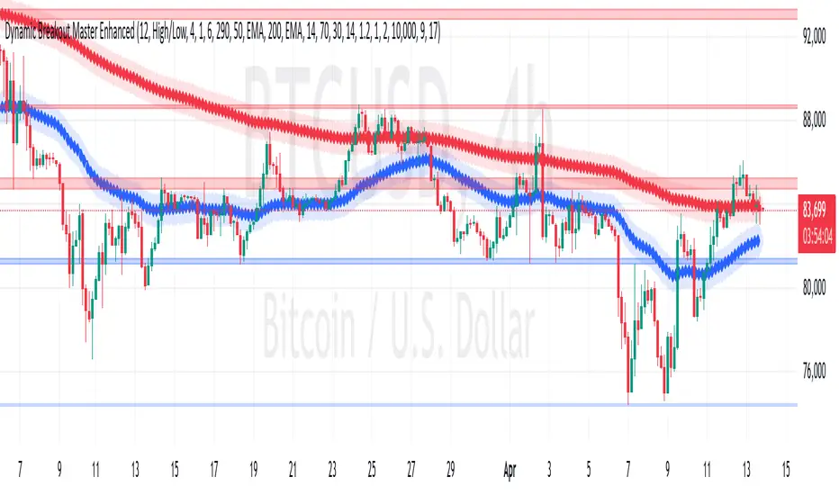 This Pine Script implements a trading strategy called "Dynamic Breakout Master" 💥. The core idea of the strategy is to identify breakouts (price movements) at key support 💙 and resistance 🔴 levels, through a dynamic channel that adapts to the market’s conditions. Here's how it works: