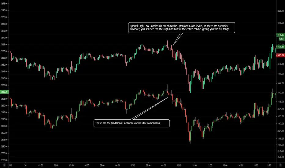 This is an interesting take on candlesticks. These special High-Low Candles do not show the Open and Close levels, so there are no wicks. However, you still see the the High and Low of the entire candle, giving you the full range.