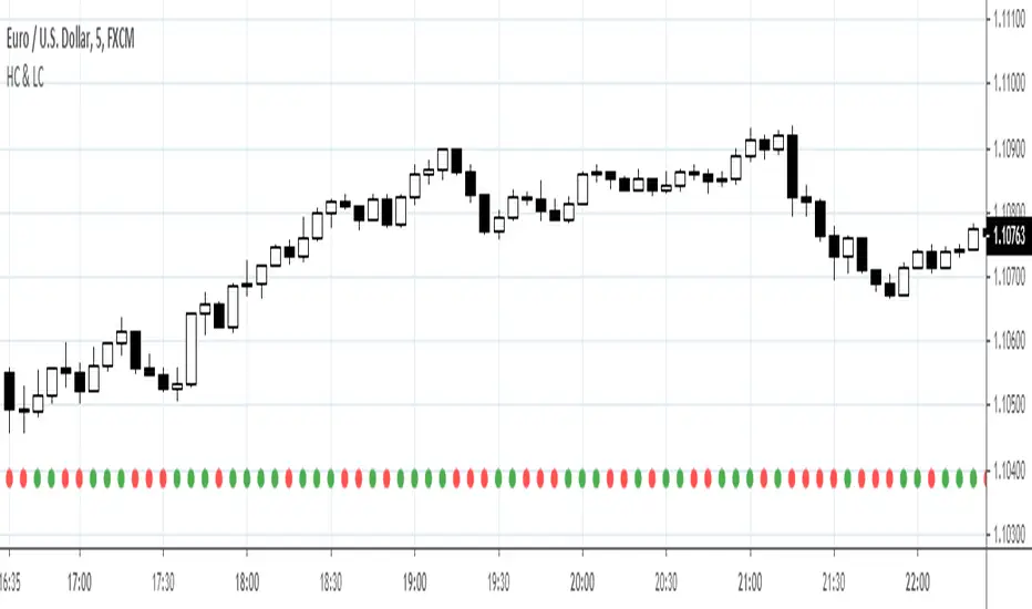 Some strategies depend on a higher or lower close than the previous bar's close. With lower time frames and small bars, this can be time consuming. The indicator reduces the time for such decisions by colour indicating the condition. A higher close than the previous bar is denoted by a green dot at the bottom of the screen, red for a lower close and blue for an equal close.