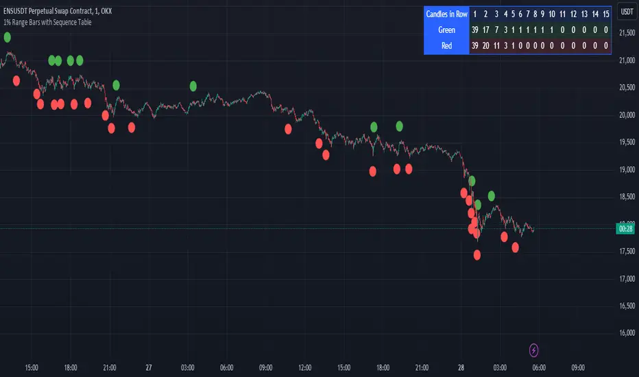 The script is designed to help traders visualize and analyze price movements on the chart, where each 1% movement is highlighted with a corresponding symbol. Additionally, the table helps track and analyze the number and length of consecutive price movements in one direction, which can be useful for identifying trends and understanding market dynamics.