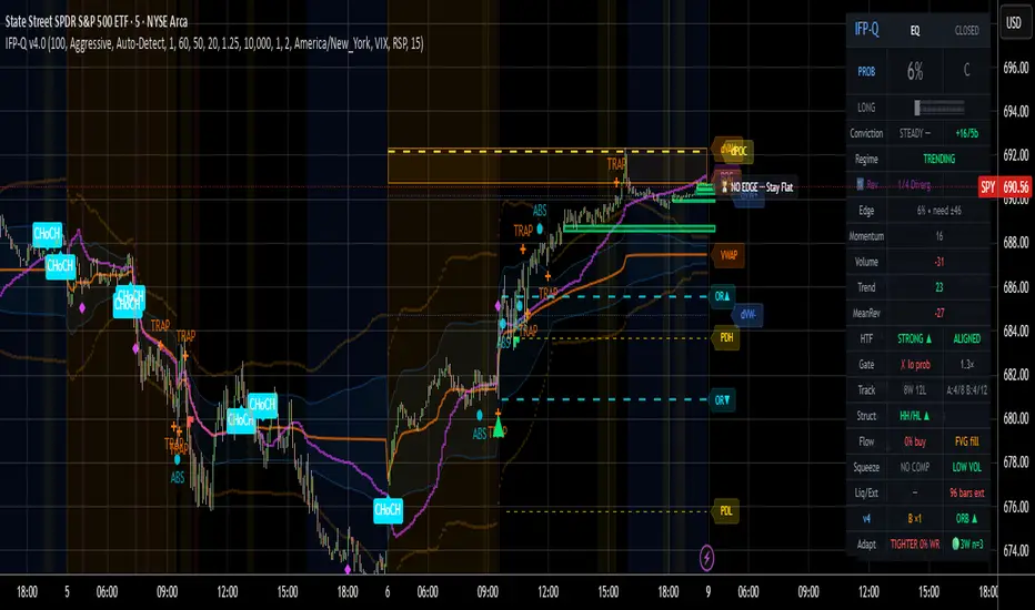 Institutional Flow Pro — Quant (IFP-Q) is a multi-module probability engine that combines momentum, volume, volatility, and structural analysis into a single adaptive system. The indicator detects the current market regime and adjusts its thresholds, cooldowns, and signal requirements accordingly.
