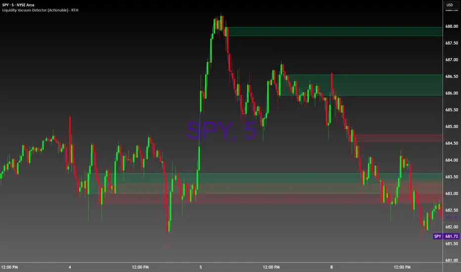 This indicator identifies liquidity vacuum zones—price areas where the market previously moved quickly with little resistance. These zones often allow price to travel faster once re-entered, which is favorable for intraday options trading.