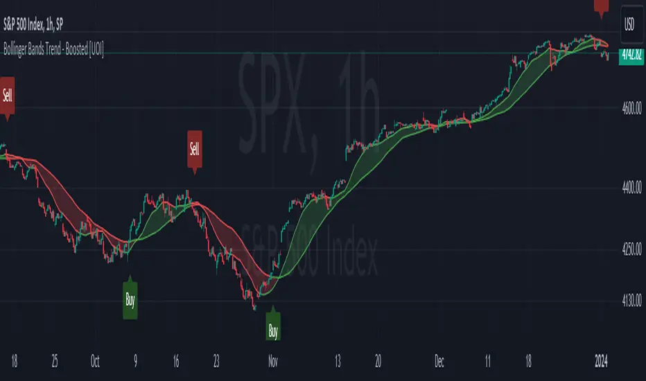 Crossover and Crossunder Detection: Detects crossovers and crossunders between the 20-period and 50-period Bollinger Bands, which can signal potential trading opportunities. Color filling and the change of color of the Bollinger midlines provide a great visual for trend detection. The color filling even without the Buy and Sell signal clearly shows the direction of the trend: