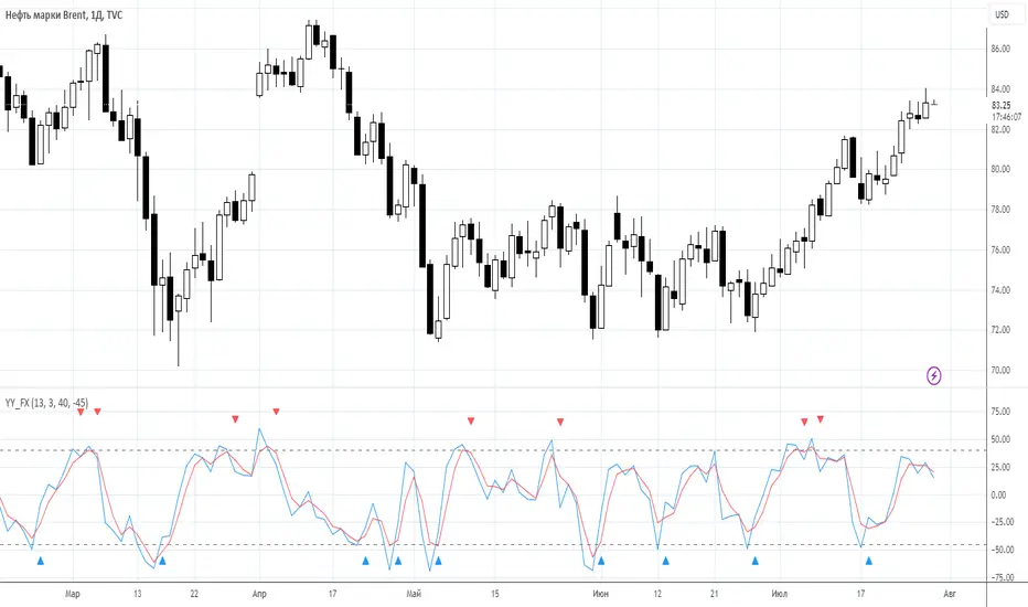 Indicator consists of two oscillatory lines: main (blue colored) and signal (red colored). Overbought and oversold zones are indicated with black dotted horizontal lines.