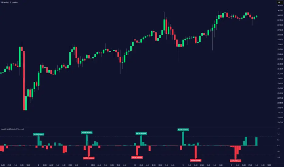 Liquidity Void Detector (Zeiierman) is an oscillator highlighting inefficient price displacements under low participation. It measures the most recent price move (standardized return) and amplifies it only when volume is below its own trend.