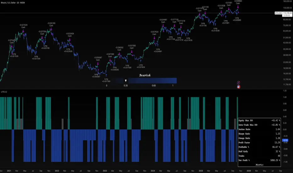 UTFS V2 | QR is a rules-based trend system that blends three complementary engines into one Trend Probability Index (TPI) and executes long / flat positions directly in the Strategy Tester. It is designed to participate in sustained trends, stand aside during weak/hostile regimes, and present performance/diagnostics in a clean, self-contained chart.