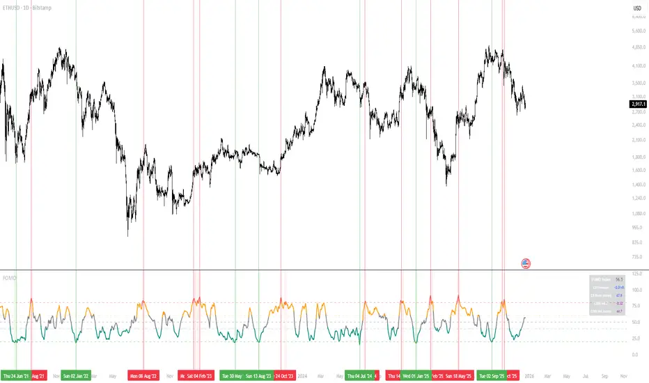 This indicator combines two real-time data sources to create a composite "FOMO score" scaled from 0 to 100: