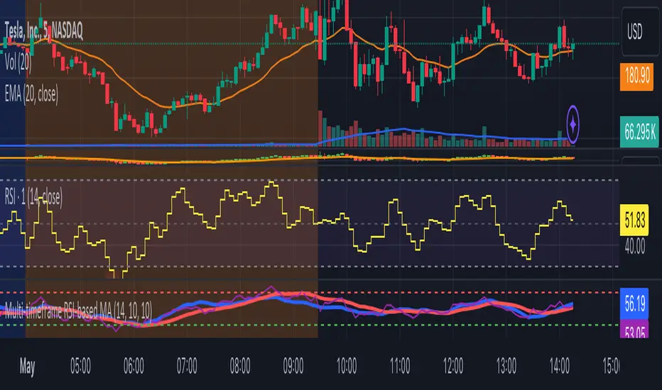 - **Bearish signal**: Conversely, if the 1-minute RSI-based MA crosses below the 5-minute RSI-based MA, it could suggest the beginning of a downward trend.
