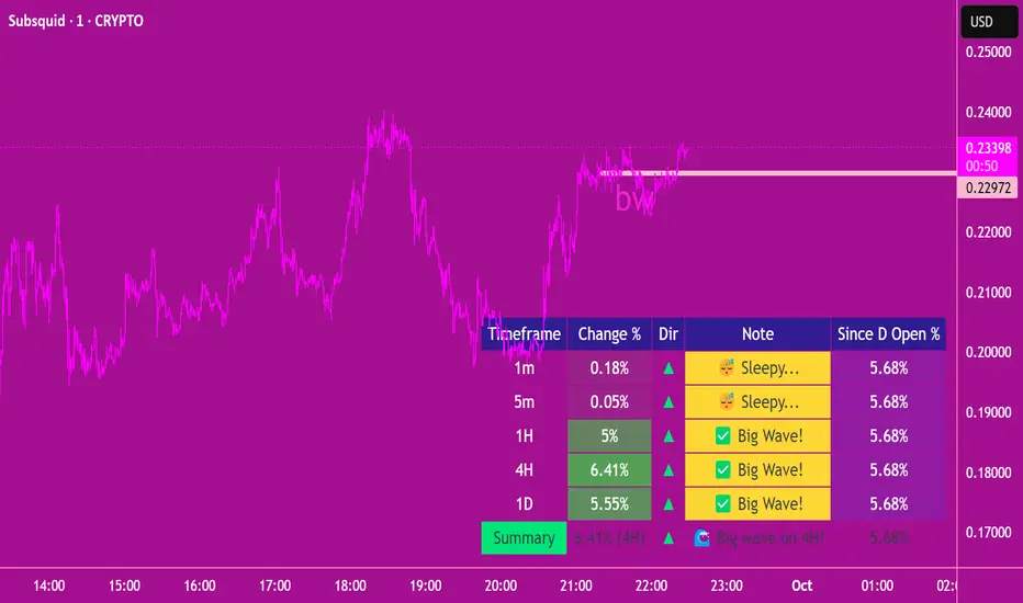 Scans motion by measuring percent change across the main timeframes: 1m, 5m, 1H, 4H, 1D. Results are shown in a compact on-chart table with direction arrows, optional heatmap coloring, and a clear summary of which TF is making the biggest wave right now.