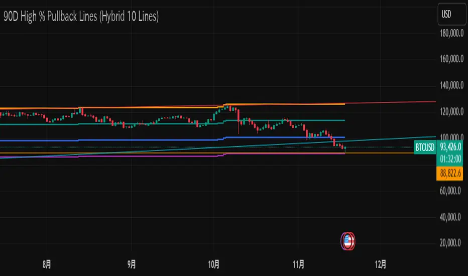 90D High % Pullback Lines (Hybrid 10 Lines) visualizes drawdown levels from the 90-day high, with up to 10 fully customizable percentage-based lines.