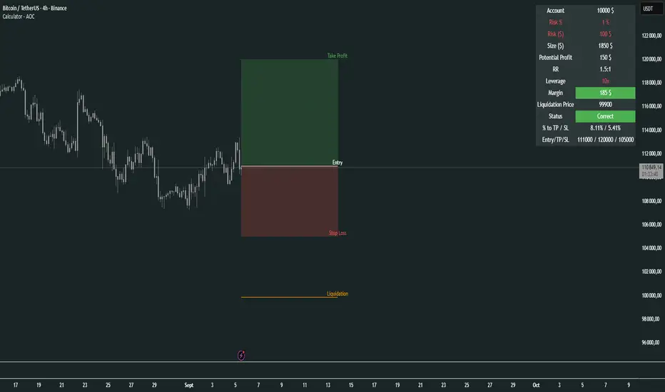 The Calculator - AOC indicator is a powerful and user-friendly tool designed for TradingView to help traders plan and visualize trades with precision. It calculates key trade metrics, displays entry, take-profit (TP), stop-loss (SL), and liquidation levels, and provides a clear overview of risk management and potential profits. Perfect for both novice and experienced traders! 💡