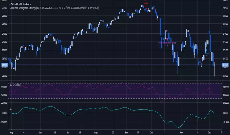 This simple strategy demonstrates the value of confirmed divergence. An entry is selected based off of divergence in the RSI where the first extreme is overbought or oversold. This must then be confirmed by divergence on the Awesome oscillator . The result is an alert that is more reliable than single divergence on either indicator, and an entry is only keyed on an overbought/oversold level.