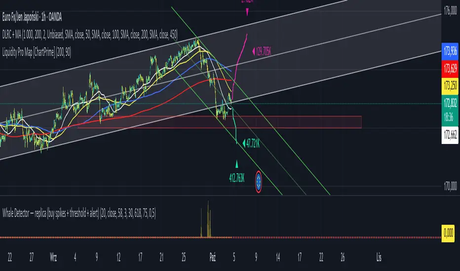The DLRC + MA indicator is an advanced technical analysis tool that combines double linear regression channels with a moving average ribbon (MA Ribbon). Designed for traders who want to simultaneously track trend, volatility, and potential support/resistance levels.
