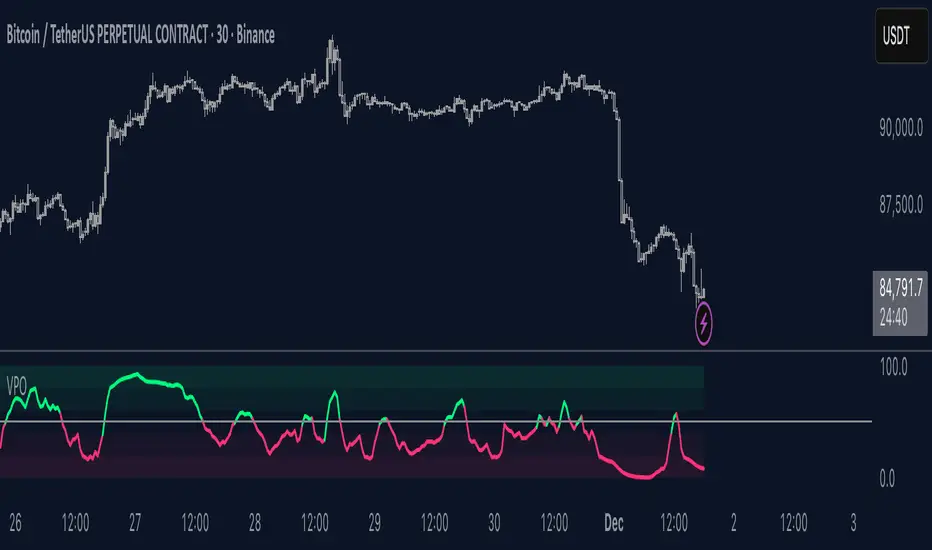 Unlike traditional oscillators that treat extreme readings (above 80 or below 20) as overbought/oversold reversal signals, the VPO is engineered to oscillate within extreme zones during strong trends. When sustained buying or selling pressure exists, the indicator remains elevated (e.g., 80-95 or 5-20) rather than quickly reverting to neutral. This makes it useful for trend continuation identification rather than exclusively for reversal trading.