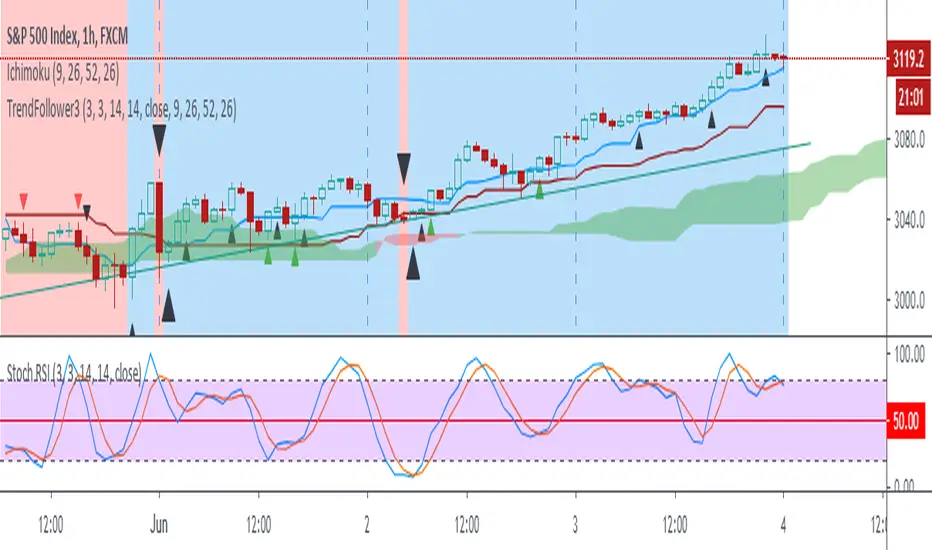 This script determines, plots and alerts on probable trend initiation and continuation points, using tenkan-sen(conversion line of ichimoku), kijun-sen(baseline of ichimoku) and stochastic RSI, for 1 H SPX.