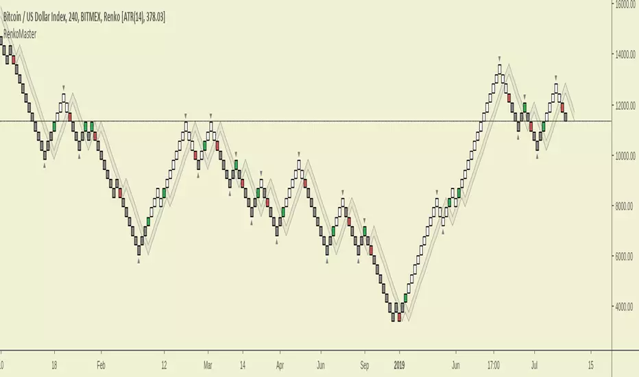 By default, RenkoMaster will colour your candles in black and white. White candles indicate an uptrend in an asset and the candles will not change colour until the trend has reversed and a counter-trend signal has been printed. Black candles indicate a downtrend, they will remain black until a counter-trend long signal candle has been printed.