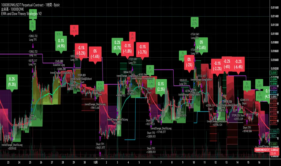 本ストラテジーは、V1 を大幅に拡張した EMA × ダウ理論 × スイング構造 × 上位足トレンド可視化 の複合型モデルです。 短期〜デイトレード向けに最適化されており、仮想通貨・FX・株式・指数など幅広いアセットで利用できます。