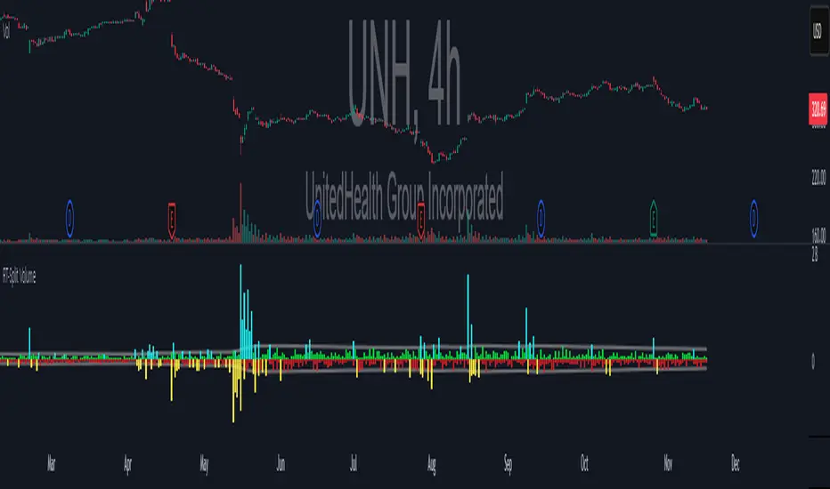 The Split Volume Indicator uses an algorithm to estimate the buy and sell volume for each candle. All of the buy volume is placed on the upper half of the indicator, while all of the sell volume is placed on the lower half of the indicator. As the bulls and bears trade back and forth on each candle, the algorithm calculates a baseline average of the volume that is being traded. This average baseline is shown by the gray Ghost Line. Abnormal spikes of volume that exceed the Ghost Line are color coded with either blue (bullish) or yellow (bearish) candles.