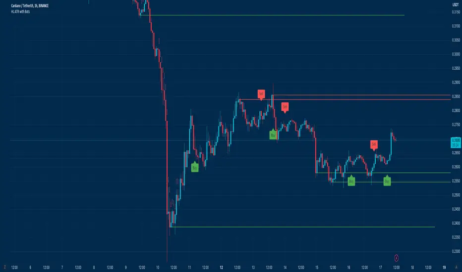 Dear users, we are thrilled to announce the latest update to our "HL ATR with Bots" indicator. We have now added green and red arrows at the high and low points respectively, offering a more visually intuitive understanding of the market trends. These arrow indicators are filtered through the Average True Range (ATR), ensuring they only appear when the price is a distance greater than the ATR away from the last high or low. We believe this increases the accuracy and sensitivity of our indicator. We've also kept the 'buy' and 'sell' labels based on your feedback. The green arrows signal potential reversals from high points, and red arrows indicate potential reversals at low points. Please combine these signals with other market information and analysis for the best results. Your feedback and engagement are always appreciated. Happy trading!סקריפט מוגן