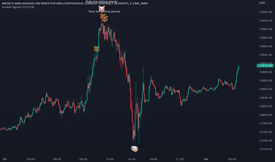 Invader Signals waits for buying/selling pressure to dissipate, by measuring the speed of recent price changes, then checks for momentum and exhaustion correlations, before signaling one of three emojis - 🐻 (bear), 🐮 (bull), or 🐷 (pig) - once these confirmation conditions are met.