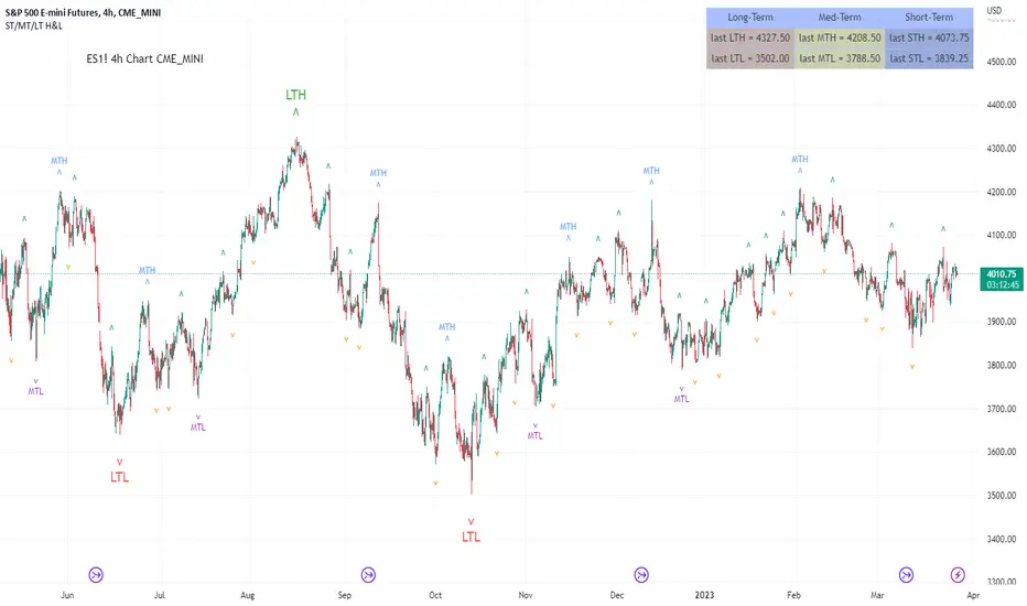 -Added Alert conditions. Set alerts by clicking three dots on indicator status line. 6 alerts: Crossover latest LTH, MTH or STH. Crossunder latest LTL, MTL or STL.-Added Table showing most recent Short, Med & Long-term pivot highs and lows. User can toggle on/off the display table.