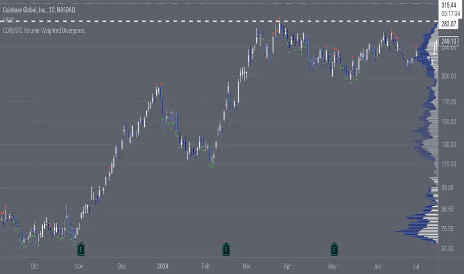 The COIN/BTC Volume-Weighted Divergence indicator identifies buy and sell signals by analyzing deviations between Coinbase and Bitcoin prices relative to their respective VWAPs (Volume-Weighted Average Price). This method isolates points of potential trend reversals, overextensions, or relative mispricing based on volume-adjusted price benchmarks.