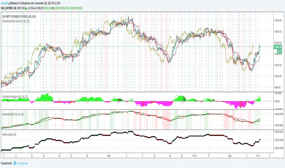 Here is an alternate way to look at Ichimoku. Instead of computing Ichimoku components only on "close", this indicator computes it for Open,High, Low and Close. I then average out the values and see if all of them are trending up or down