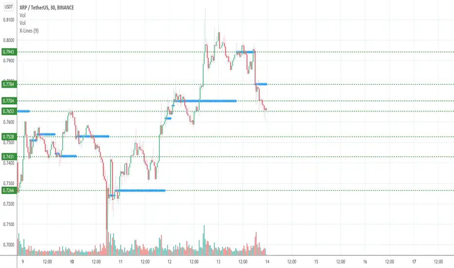 Индикатор X-lines давно известен для пользователей торговой платформы Metatrader 4 & 5. Он показывает интересные рынку цены (уровни поддержки и сопротивления). Индикатор работает без опоздания и как только бар будет закрыт по интересующей рынок цене, тут же над ним появится символ "X" и начнется прорисовка уровня до следующего важного значения. Уровни (цены) которые указывает индикатор являются истинно важными для рыночного процесса (по ним отрабатывается или отрабатывался в прошлом крупный объем сделок). Соответственно подобные цены в будущем могут быть целью торгового процесса и могут выступать, как поддержкой так и сопротивлением.