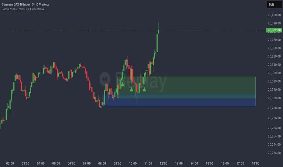 This indicator marks close-based entry signals for DAX / GER40 on the 1-minute timeframe, using two fixed intraday zones: