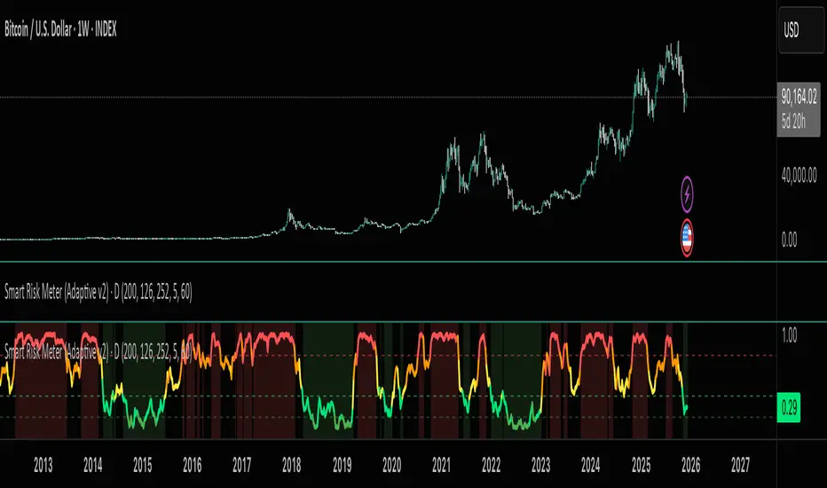 The Smart Risk Meter reads momentum, distance from the long-term trend, and drawdown pressure, then adapts those signals to the asset’s volatility. Low-vol assets get tighter scaling, high-vol assets get wider scaling, so the 0–1 risk score stays meaningful on anything from SPX to BTC.