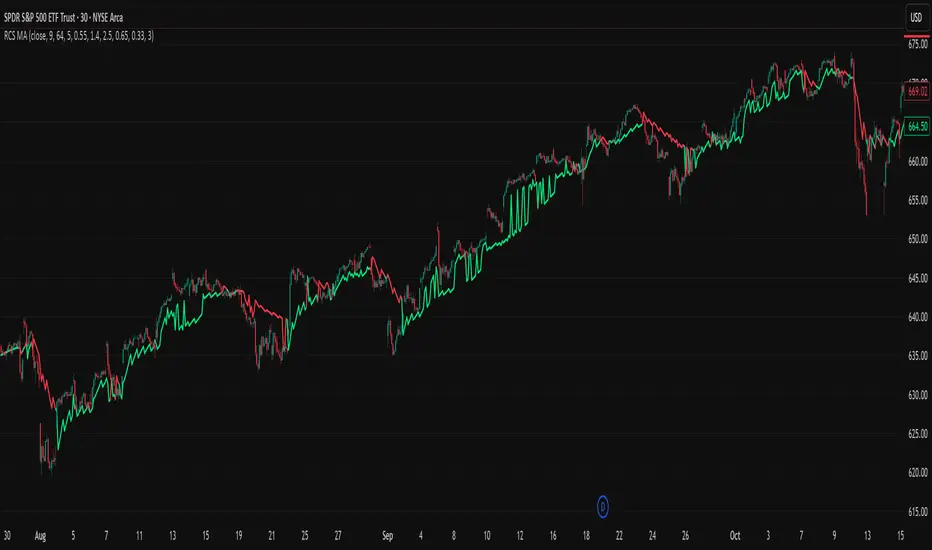 RCS MA is a reactive curvature smoother for any liquid instrument on intraday through swing timeframes. It helps you act only when context strengthens by adapting its window length with a normalized path energy score and by smoothing with robust residual weights over a quadratic fit, then optionally blending a capped one step forecast. Add it to a clean chart and watch the single colored line. Shapes can shift while a bar forms and settle on close. For conservative use, judge on bar close.