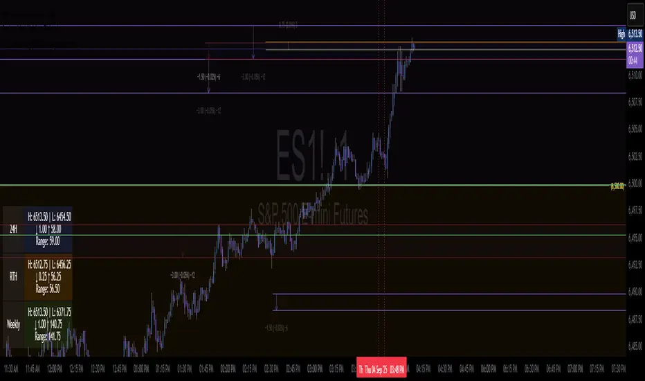 table that shows rth eth and full weekly range high and low with range difference from high and low
