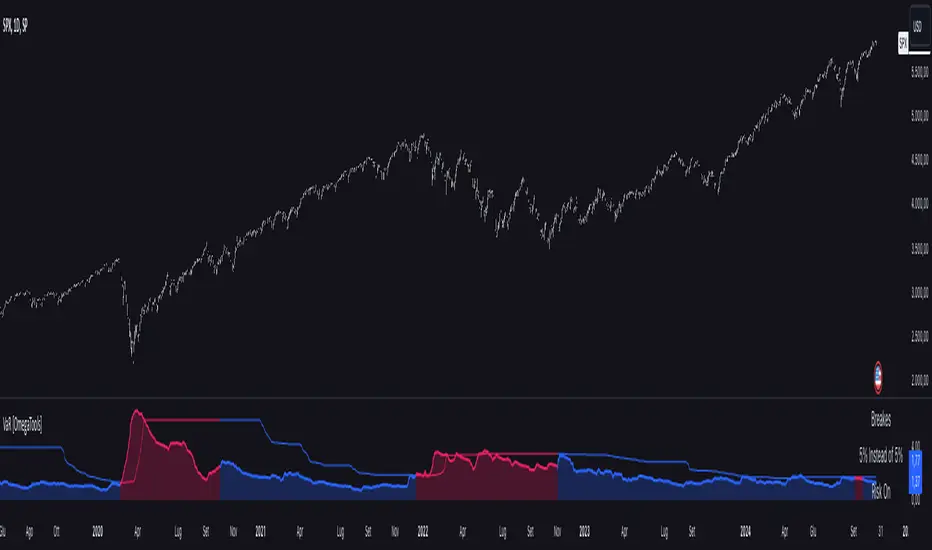 - Risk Off: If the break effect exceeds the confidence level (e.g., more than 5% of periods show returns breaching the VaR threshold), the market is deemed to be in a high-risk state, and the script signals a "Risk Off" phase. This indicates bearish market conditions where the likelihood of significant losses is higher.