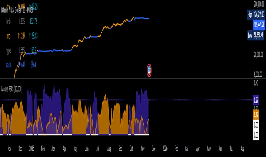 Majors RSPS - TradingView DescriptionMajors RSPS (Relative Strength Portfolio System) is an advanced portfolio allocation indicator that dynamically distributes capital across 14 major cryptocurrencies based on relative strength analysis and macro risk factors. It automatically identifies the strongest performers and adjusts cash allocation based on market conditions.