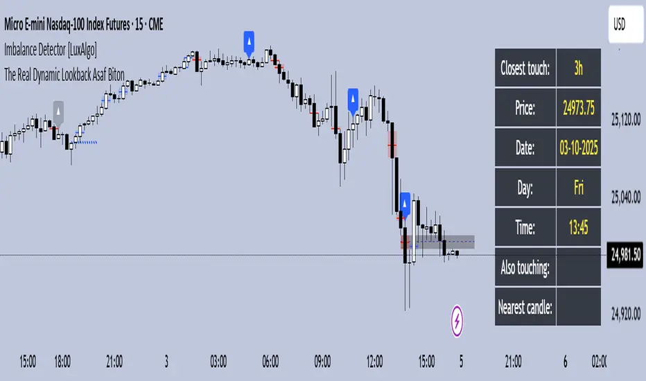 תצוגת HUD: מציגה בזמן אמת את הנר הקרוב ביותר שנוגע בטווח המחירים של הנר הנוכחי, כולל המחיר, התאריך, היום והשעה.