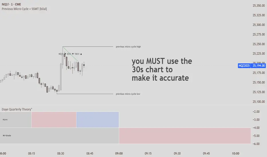 This indicator tracks 22.5-minute micro cycles within ICT's Quarterly Theory framework and automatically detects Smart Money Technique (SMT) divergences across correlated indices (NQ, ES, YM). It visualizes previous cycle ranges and identifies high-probability manipulation completions for precise intraday entries.