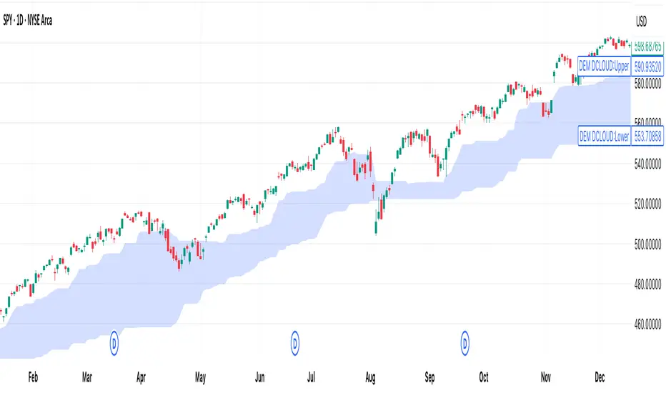 [DEM] Donchian Cloud is designed to create a visual cloud overlay on the price chart using two Donchian Channel midlines of different periods (26 and 117 bars) to identify trend direction and potential support/resistance zones. The indicator calculates the average of the highest high and lowest low for each period, plots these as nearly transparent blue lines, and fills the area between them with a color-coded cloud that changes from blue to red when the longer-period midline (117) crosses above the shorter-period midline (26), indicating a potential bearish shift in the longer-term trend. This cloud system helps traders visualize the relationship between short-term and long-term price equilibrium levels, with the cloud color providing a quick reference for overall trend bias and the cloud boundaries offering dynamic support and resistance levels.