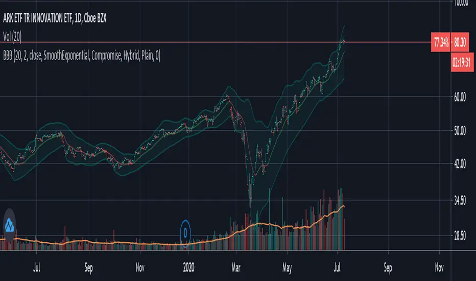 Will never annoy you by rescaling log charts due to negative lower bands (much like my previous geometric bollinger bands) , and will almost always give more realistic bounds on price movement than standard bollinger bands, particularly during high-volume events such as broken supports, earnings reports, or squeezes.