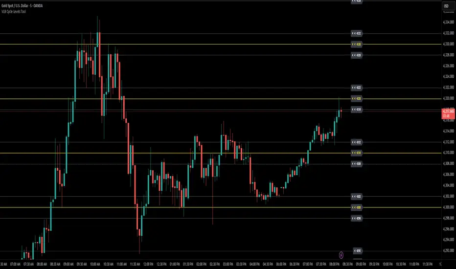 The VLB Cycle Levels Tool is intended for traders who prefer an objective way to observe structural cycles and level-based behavior on XAUUSD as market conditions change.