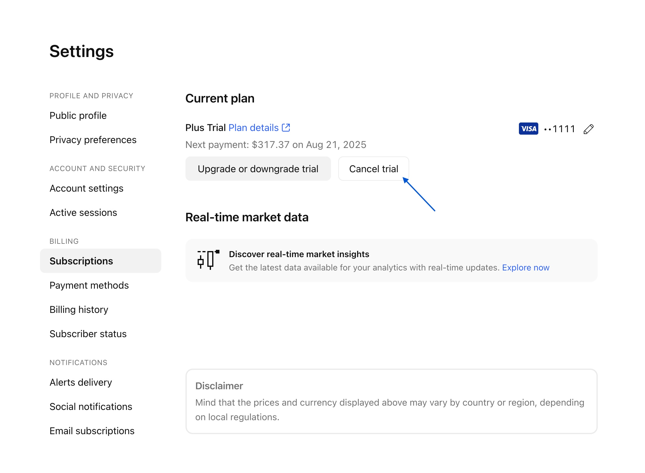ניתן לבטל את תקופת הניסיון החינמית בלחיצה אחת. לשם כך, עבור אל הגדרות וחיוב ← מנויים ← ביטול תקופת ניסיון.