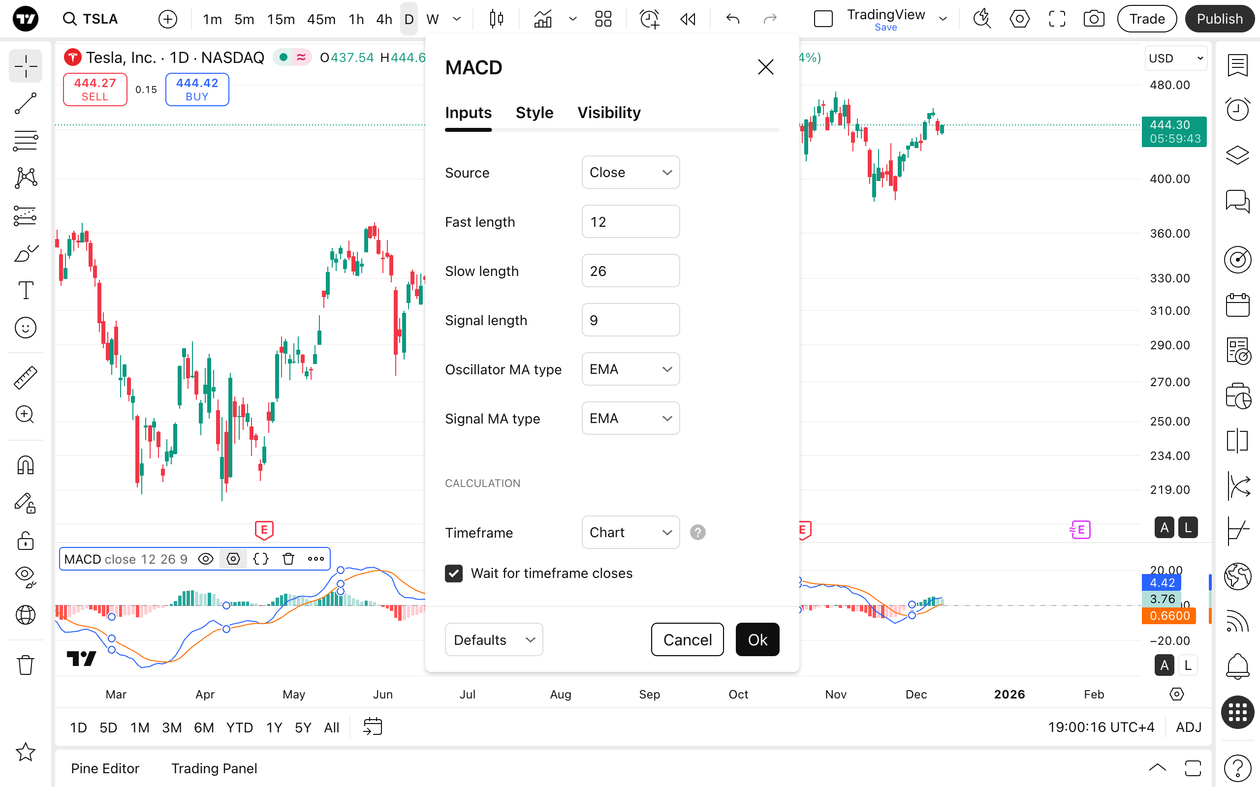 אינדיקטור זה כולל תנאי התראה עבור מתי ההיסטוגרמה משתנה מחיובית לשלילית, ולהיפך, כדי לאותת על הנקודות שבהן המומנטום עשוי לנוע בין מצבים עולים ויורדים. עיין במאמר "תחילת העבודה עם התראות טכניות" כדי ללמוד כיצד להשתמש בהן.