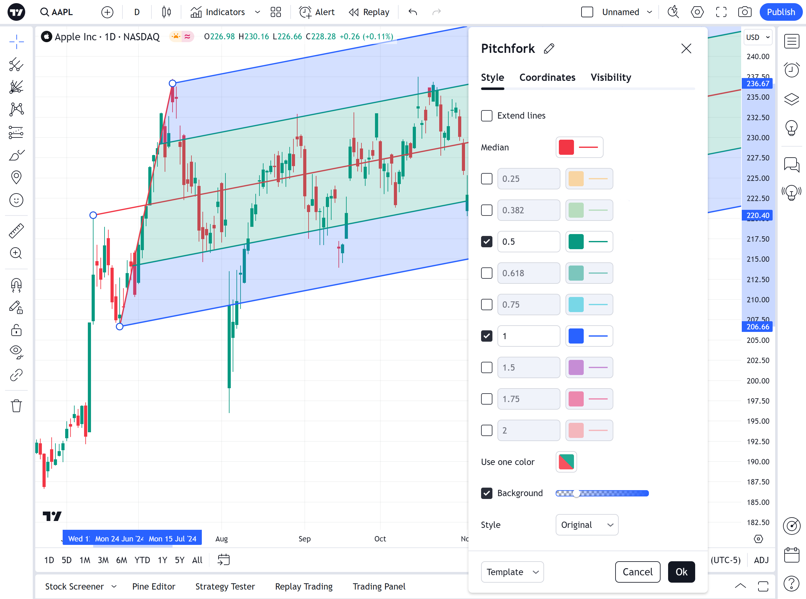 הקילשון נוצר על ידי שרטוט קו מגמה ראשון בין שתי נקודות קיצון. לאחר השרטוט של הקו הראשוני נקבעת נקודה שלישית מעל או מתחת לנקודה השנייה בהתאם למיקום הקילשון הרצוי לך. זכור שהגדרת ברירת המחדל של הקילשון דורשת שרטוט של שתי קבוצות נוספות של קווים. TradingView מאפשרת להוסיף עד 9 סטים של שורות. במידה ויתווספו שורות נוספות, ניתן יהיה לשמור הגדרה זו כתבנית לצורך שימוש מאוחר יותר.