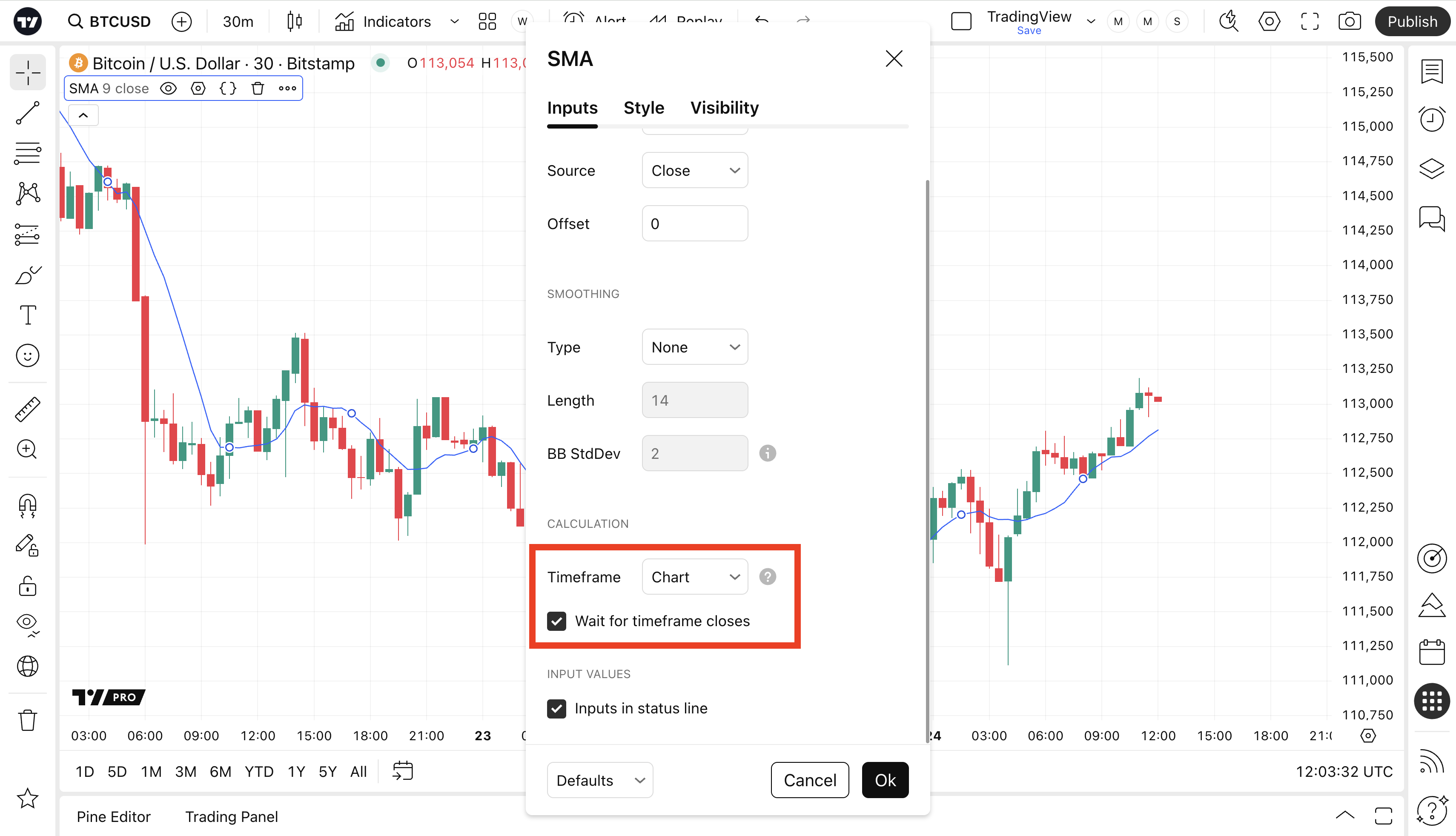 רבים מהאינדיקטורים המובנים שלנו מגיעים עם פונקציונליות MTF. כאשר הם עושים זאת, הכרטיסייה "הגדרות/קלט" של הסקריפט תכיל את הקטע "חישוב" עם תפריט נפתח של "מסגרת זמן", משם תוכל לבחור את מסגרת הזמן שבה אתה רוצה שהאינדיקטור הספציפי הזה יחושב. זה