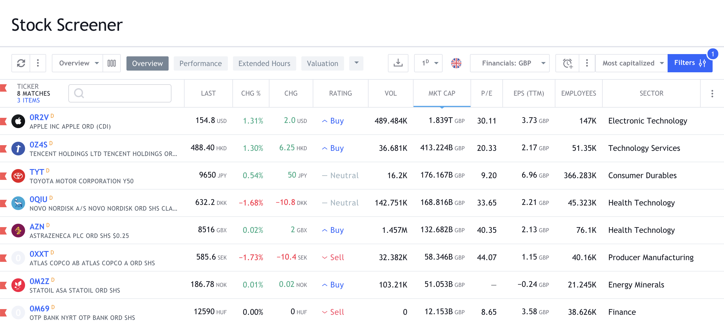 שימו לב שהעמודה שווי שוק מחושבת מחדש, ואילו העמודה LAST נשארת במטבע של החברה.