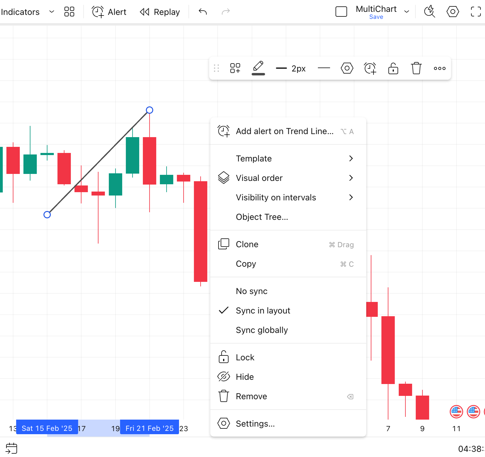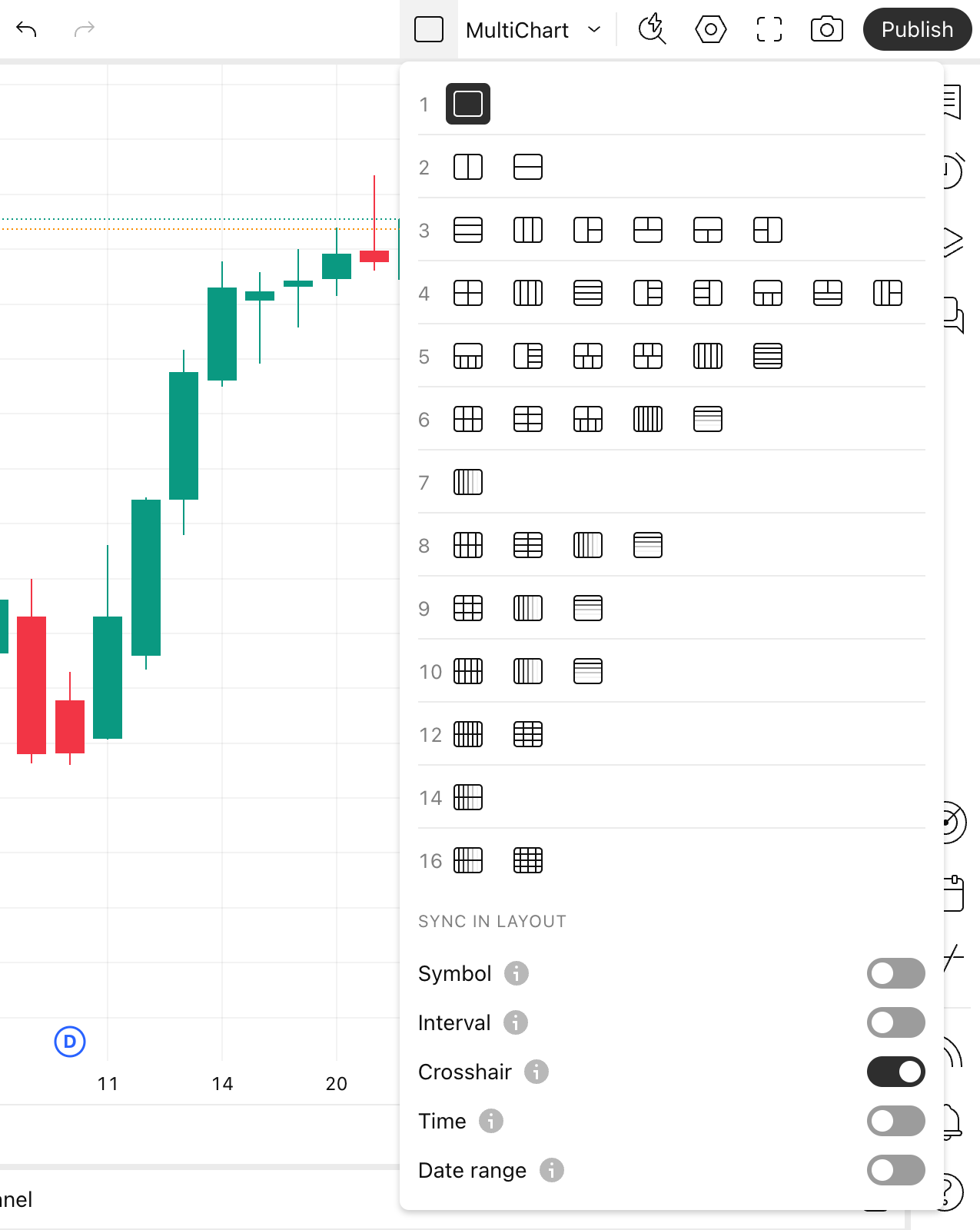 אינדיקטורים אינם מסונכרנים בין פריסות והגרפים שבתוכן. ובכל זאת, אתה יכול להחיל אינדיקטור ספציפי על כל הגרפים בפריסה על ידי לחיצה על 'הוסף אינדיקטור זה לכל הפריסה' בתפריט ההקשר של האינדיקטור.