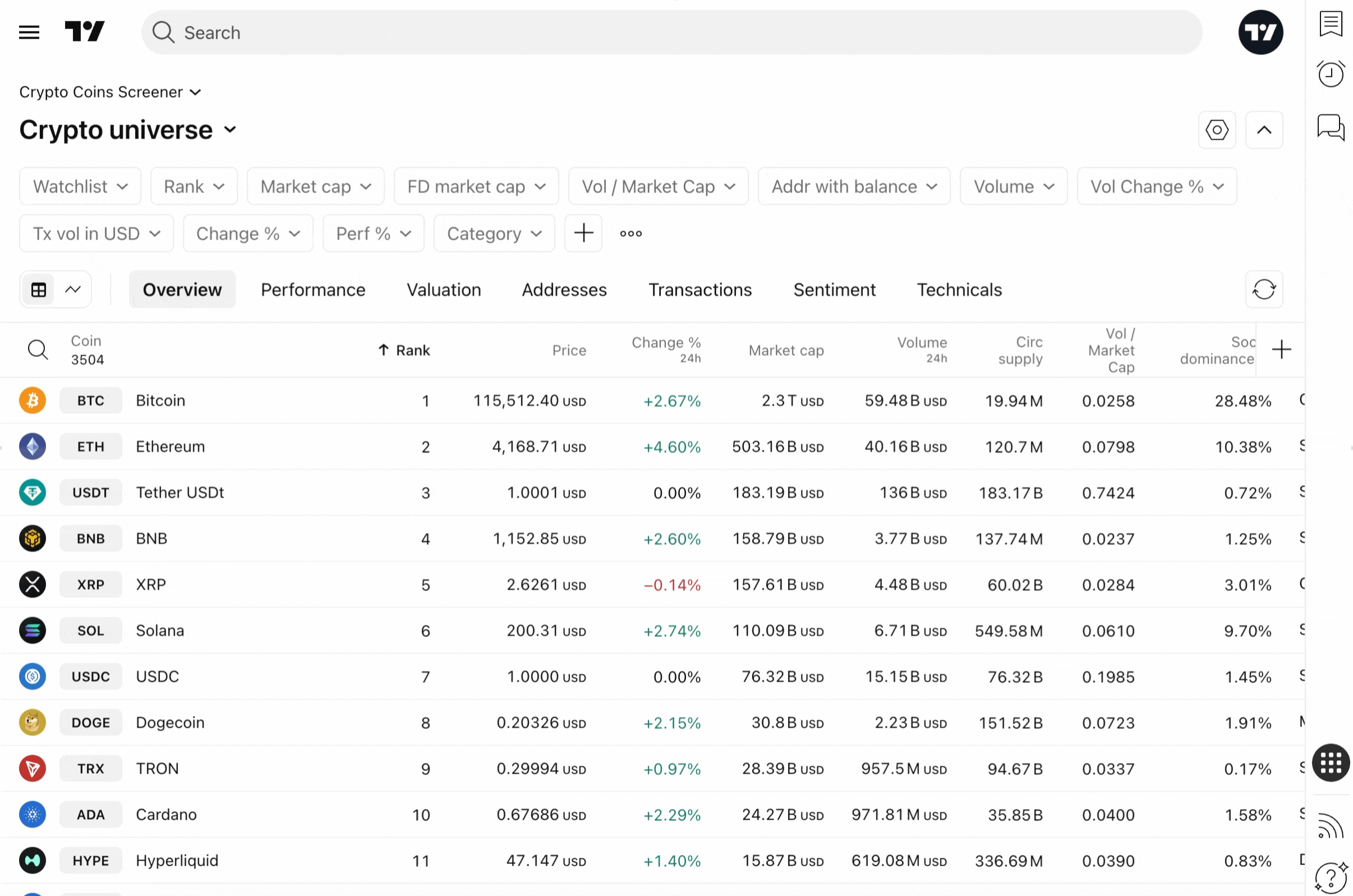 כשתפתחו את הסורק, תראו את עולם הקריפטו. כברירת מחדל, הרשימה ממוינת לפי דירוג - מיקום המטבע הקריפטוגרפי בדירוג הכללי בהתבסס על שווי השוק המחושב שלו, עם התאמות ממערכת סדרי עדיפויות פנימית המתחשבות באמינות ובפופולריות של הנכס.