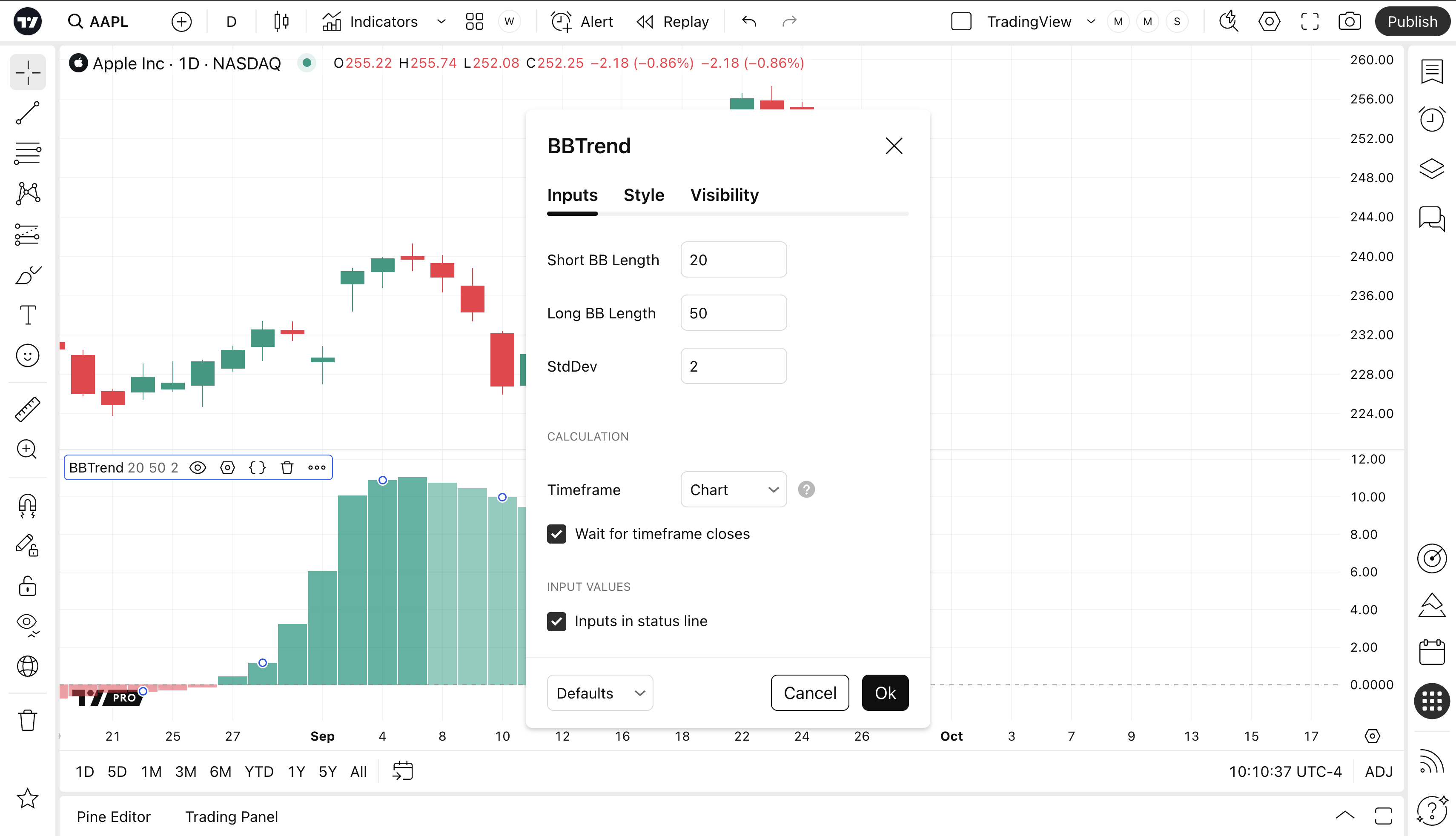 עוצמת הצבע של כל עמודה בהיסטוגרמה משקפת את הכיוון שבו BBTrend נע: עמודה ירוקה או אדומה כהה יותר מצביעה על כך שערך ה BBTrend הנוכחי מתרחק מאפס, בעוד שעמודה ירוקה או אדומה בהירה יותר מצביעה על כך שהBBTrend מתקרב לאפס, אך עדיין נמצא מעליו (בעמודות ירוקות) או מתחתיו (בעמודות אדומות).