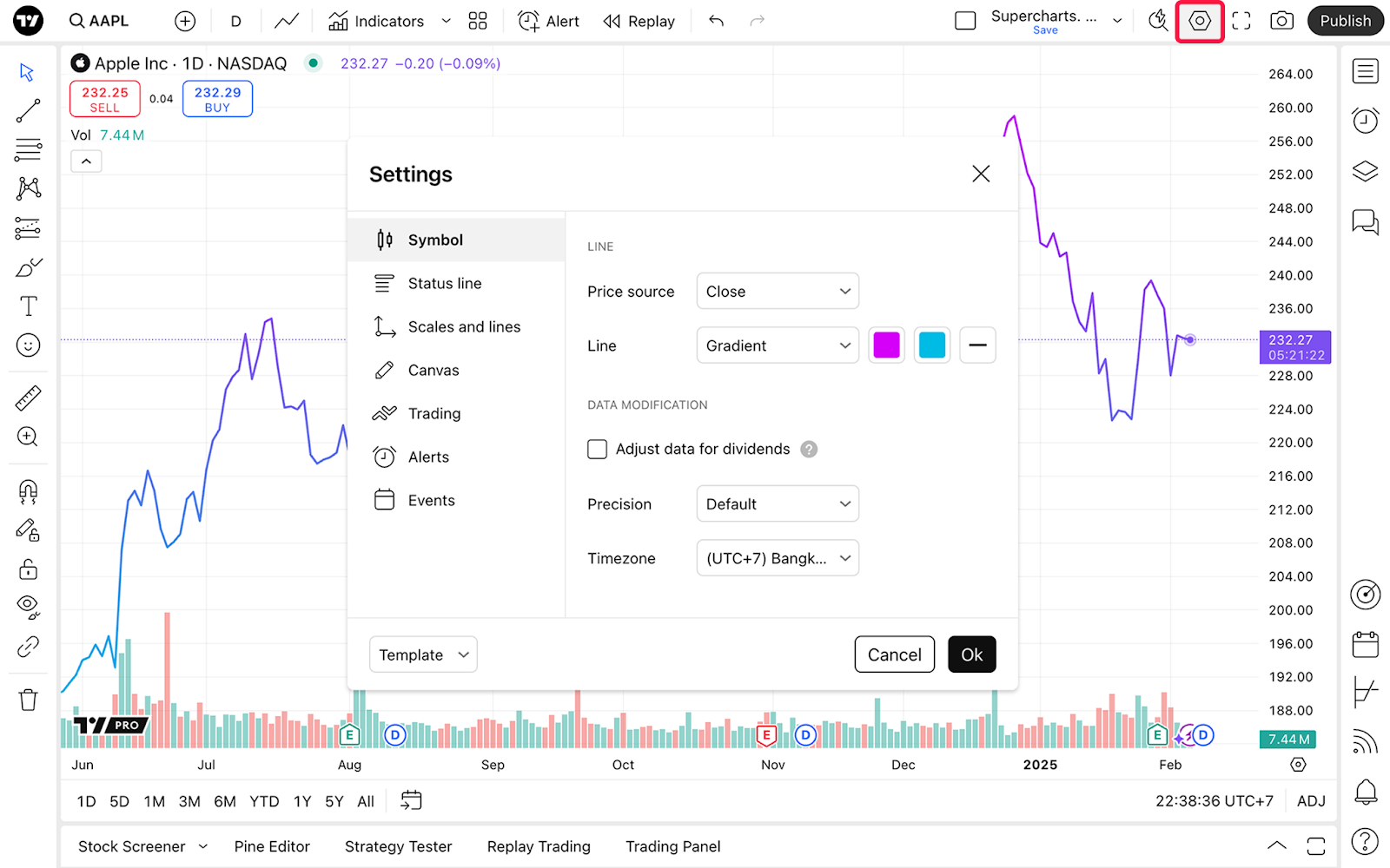 1. מקור המחיר. בחר את המחיר שברצונך להציג בגרף. כברירת מחדל, הוא מוגדר למחיר סגירה כלומר הקו יתווה על ידי חיבור מחיר הסגירה של הנכס ברצף. לפי סגנון המסחר שלך, בחר את המחיר הרצוי: