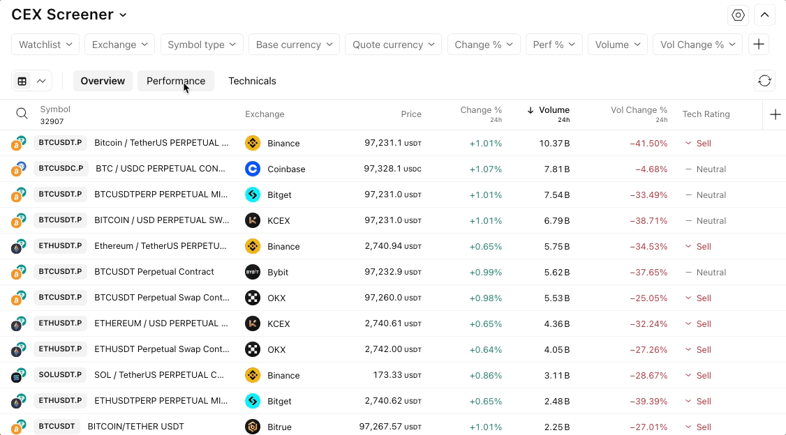 בעזרת כלי זה, אתה יכול לסרוק ולהשוות זוגות מסחר לפי מאפיינים בסיסיים (בורסה, בסיס/ציטוט, סוג סימול), נתוני שוק (למשל, נפח 24 שעות, מחיר) ומדדים טכניים.