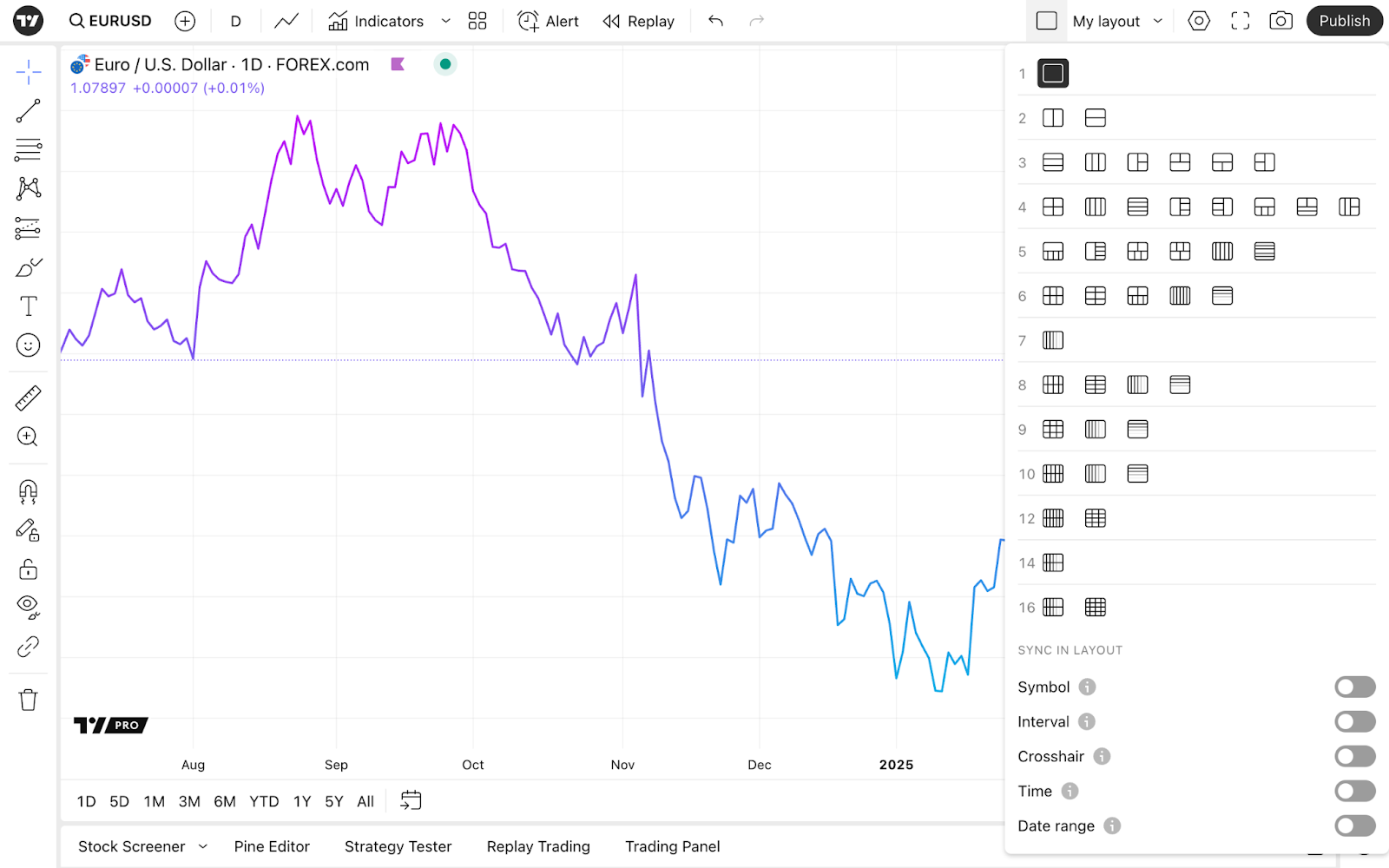 תכונה מרכזית נוספת של סופר-גרפים של TradingView היא פריסות מרובות הגרפים שלה, שתוכל למצוא בהגדרת פריסה. מצב זה מאפשר לך לקבל גרפים מרובים בסביבת העבודה שלך כדי למקסם את הניתוח שלך.